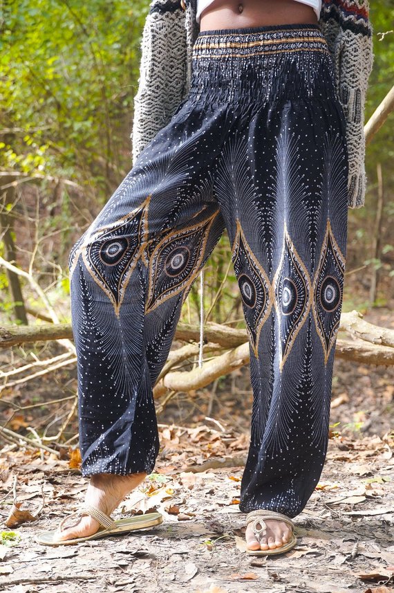 Loose and supremely comfortable Boho Pants. Standard one size fits most (US size 0-14 or XS-L). Our Boho pants are handmade with lightweight 100% rayon that is extremely breathable and flowy. One Side Pocket. Great for exercise, yoga, taking a walk in nature or the beach, festivals, family get together, or just relaxing at your home.