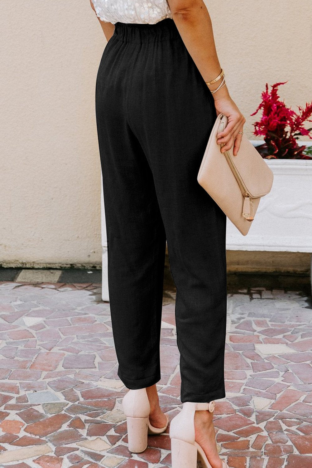 •This pair fits relaxed with an elastic waistband, side pockets and a straight leg with a cuffed hem